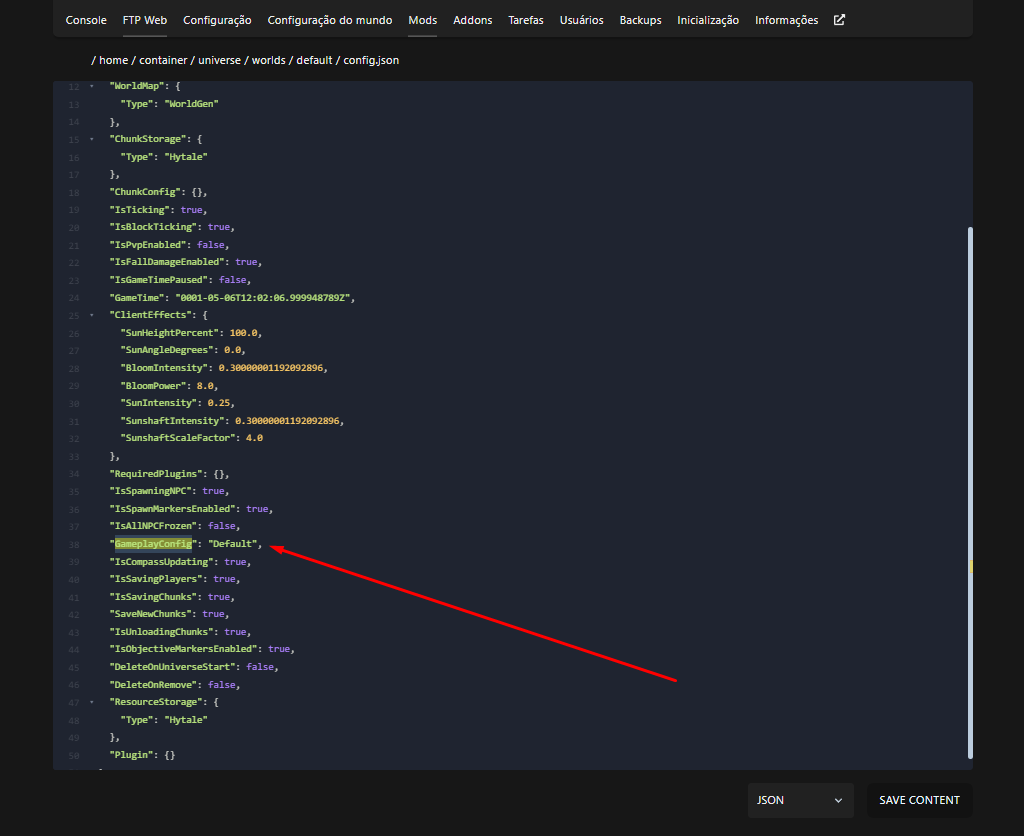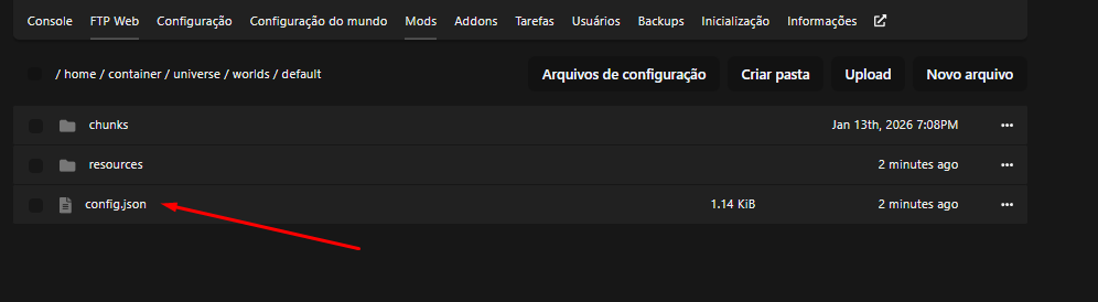 Navevegue até a pasta: /universe/worlds/default e abra o arquivo config.json