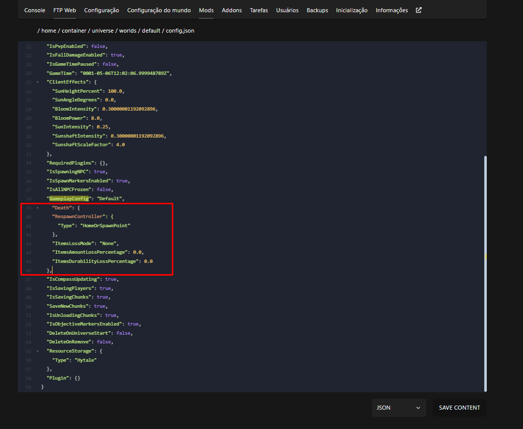 “Death”: { “RespawnController": { "Type": "HomeOrSpawnPoint" }, "ItemsLossMode": "None", "ItemsAmountLossPercentage": 0.0, "ItemsDurabilityLossPercentage": 0.0 },O resultado final deve ficar dessa forma: